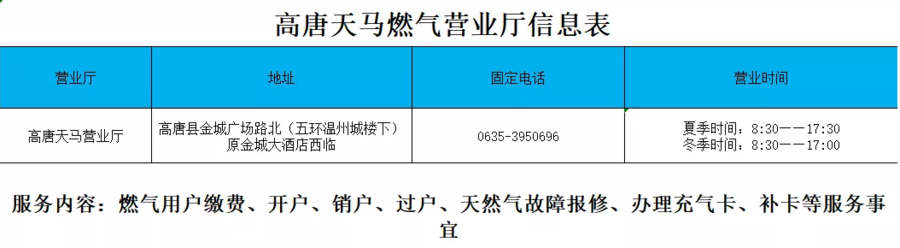 高唐天马燃气有限公司缴费、维修办理服务指南 一、缴费服务指南: (一)持卡用户需携带天然气用户卡前往金城路与鼓楼路交叉路口东北处高唐天马营业厅前去办理充值服务。 (二)上门收费用户可拨打0635-3953408,收费人员上门收取,也可前往以上标注营业厅地址,携带手机或其它方式拍摄燃气表表数正面照片前往缴纳。 (三)物联网表用户可关注高唐天马公众号,点击燃气缴费,根据燃气表标注厂家选取,根据提示填写信息完成缴费即可。 二、维修服务指南: (一)如天然气用户出现用气故障,可直接拨打0635-3953408客户服务热线,接线员接到报修电话后会第一时间前往提供上门维修服务。 (二)也可在高唐天马公众号后台进行留言,说明地址及电话,会有维修人员与您联系提供维修服务。 |